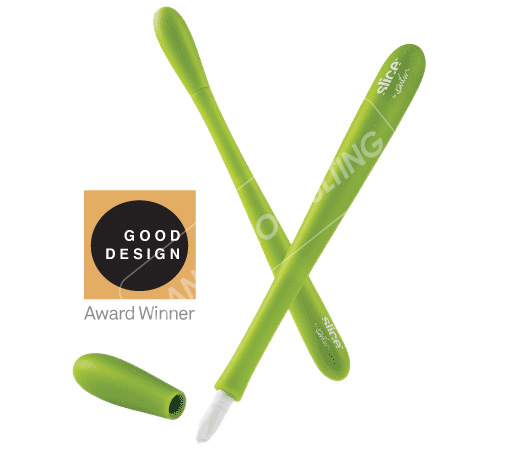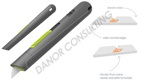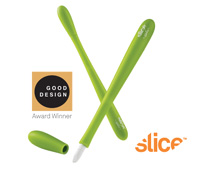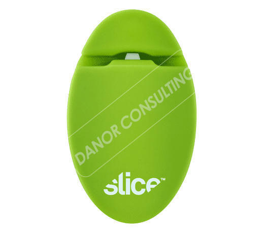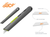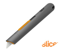 The Slice auto-retractable pen cutter is a safer alternative to a traditional utility knife. Includes one replaceable Slice ceramic safety blade. Patented handle with rubberized slider button limits the amount of exposed ceramic-blade to further reduce injuries. Pen Cutter Automatically retracts back into housing for added safety when slider button is released. Patented high-tech double-sided Slice ceramic blade SKU#10404 designed to reduce injuries by incorporating a safer rounded-tip. Sharpness level up to 10x longer than steel. Measures 135 mm L x 18 mm diameter. SKU#10512