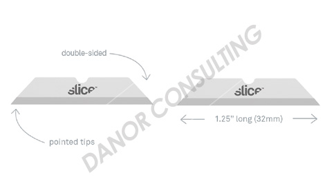 Slice patented ceramic utility blades fits most standard utility knife handles. Each pack contains two (2) rounded-tip ceramic 10524 Slice ceramic utility blades. Each blade measures approximately 63 x 19 x 0.8 mm and weights 3 gm (2.5 x 0.75 x 0.3 in - 0.1 oz). SKU#10524