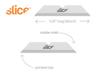 Pointed-tip Slice ceramic replacement blades, for use only with the Slice ceramic-blade cutters. Each pack contains four (4) double-sided, pointed-tip Slice ceramic blades. Each blade measures approximately 1-5/16" inches (34mm) in length. Also available in rounded safety tip (SKU#10404). For use exclusively with Slice cutting tools SKU#10400, 10503, 10512, 10513, and 10514. SKU#10408