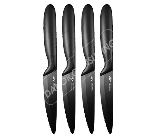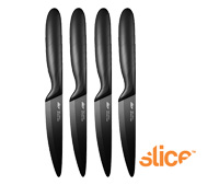 Created for Slice by world-renowned Swiss designer Yves Behar. Expertly crafted from high-carbon stainless steel and coated with non-stick black-titanium. ABS handles feature distinctive "rice-paddy" design for comfort. Serrated edge for the cutting control. Dishwasher safe. Set includes four (4) steak knives with 4"-long blade and 4"-long handle - 2.5 ounces per knife. SKU#10710.